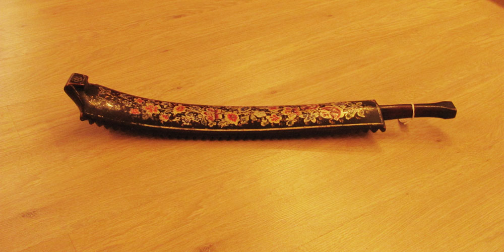 Согласно семейной легенде, этот рубель Мефодий Куприянович выиграл в качестве приза на городской ярмарке. Предмет очень красивый, изготовленный как подарочное изделие в начале XX века. Тыльную, нерабочую поверхность рубеля украшает эффектная роспись: на черном, лакированном фоне рисунок, в виде цветочной гирлянды из роз и стилизованных ромашек. Цветы и листья гирлянды раскрашены по серебристой основе в красный, синий, малиновый, зеленый и золотистый цвета. Такие нарядные, расписные рубеля были одними из излюбленных украшении крестьянского жилища.