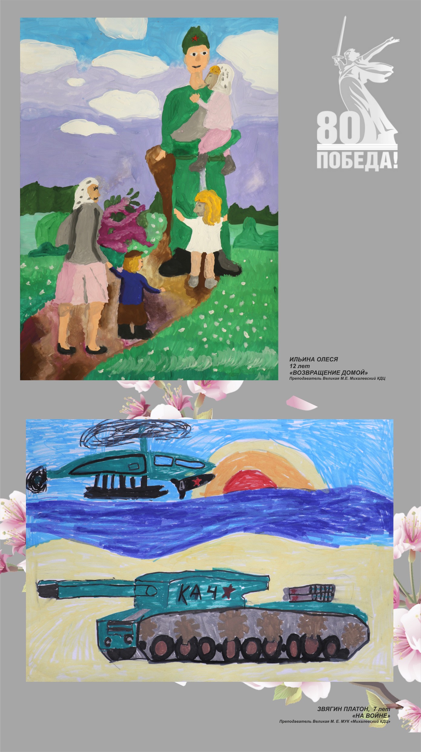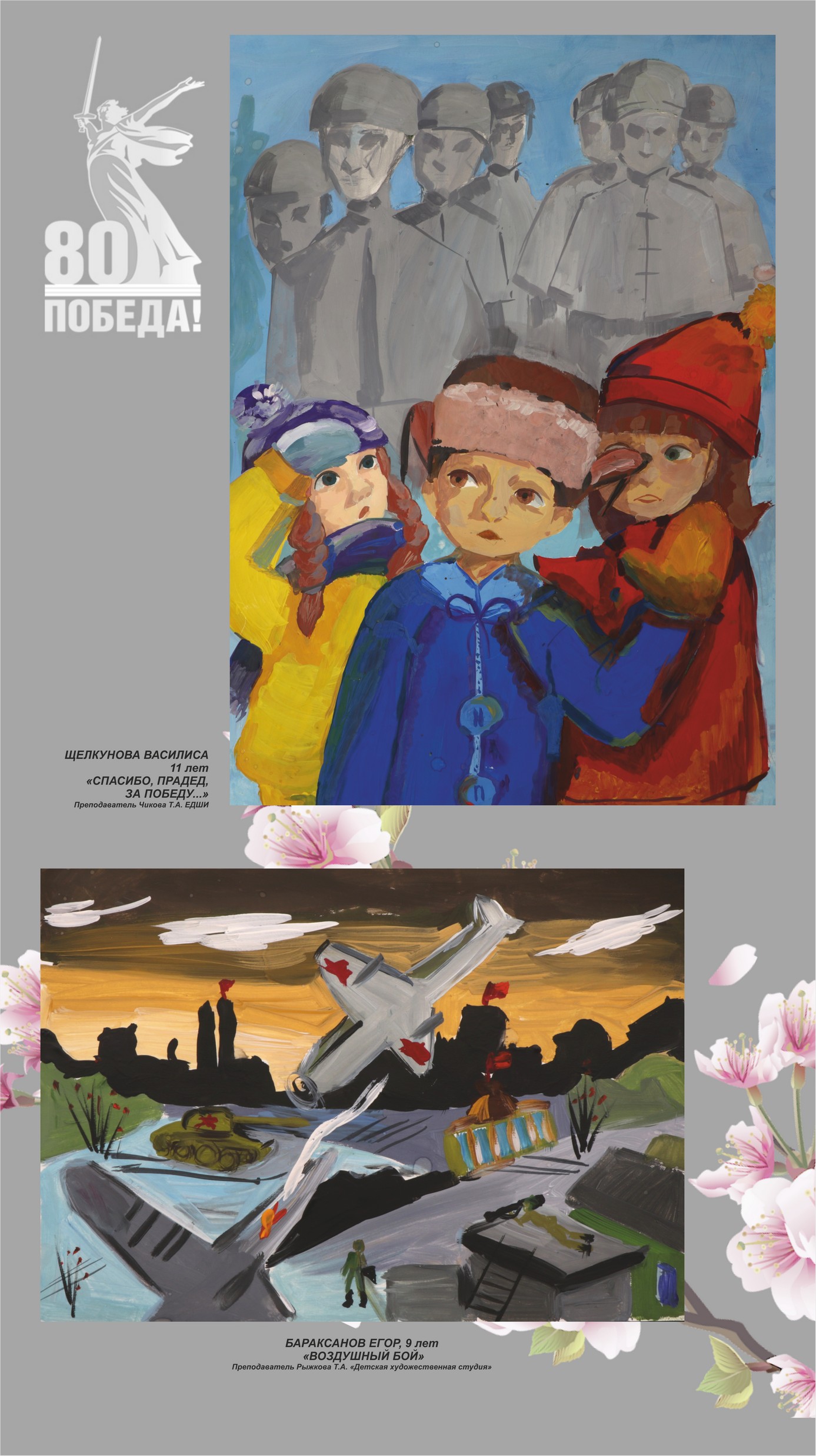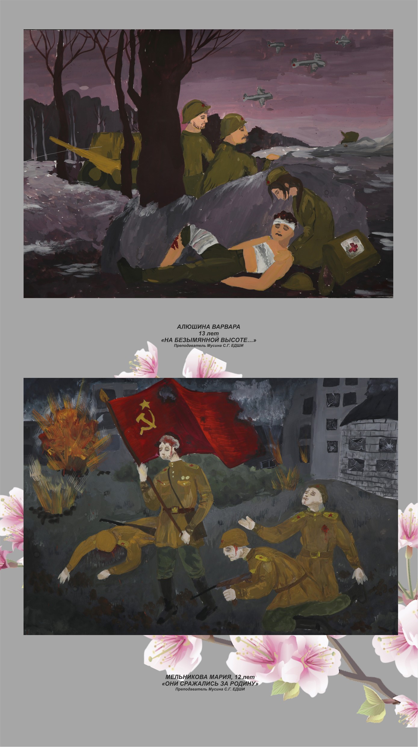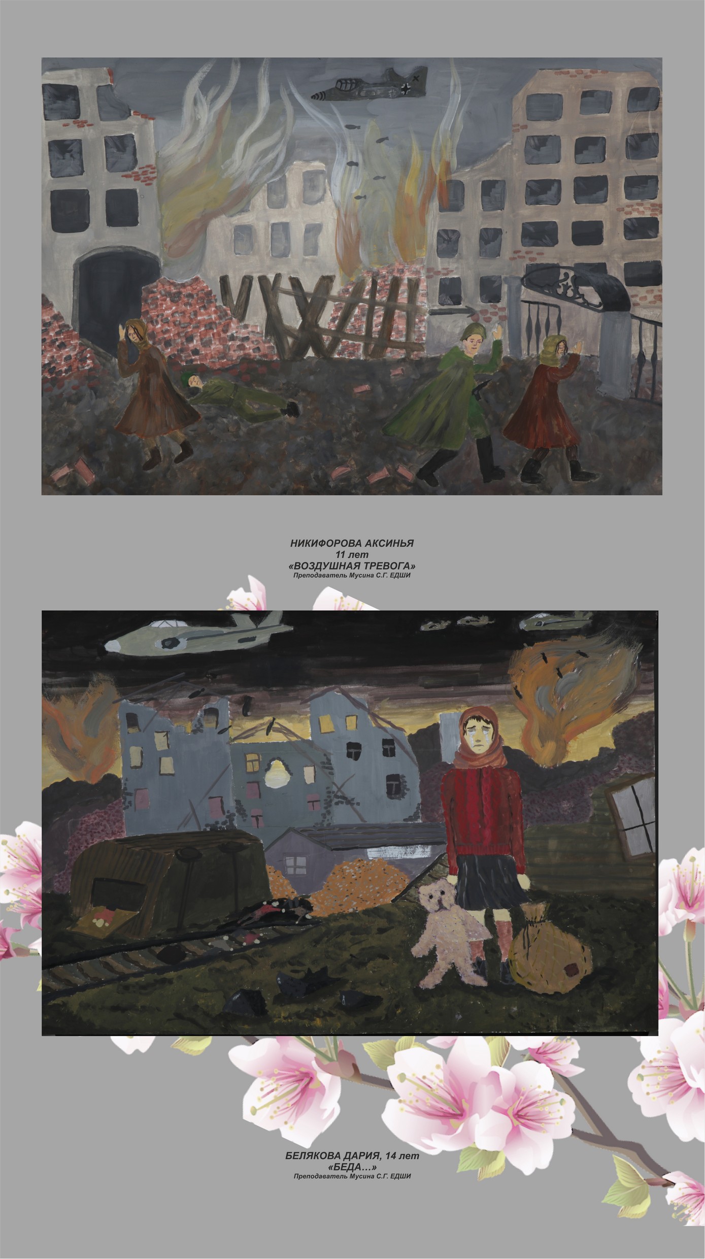 Выставку дополнили детские рисунки, — искренние и непосредственные. Они рассказывают о том, какой ценой досталась Победа, о необходимости сохранения памяти о людях, отстоявших нашу свободу, заставляют задуматься о ценности жизни и о том, как важно сохранить мир на земле.