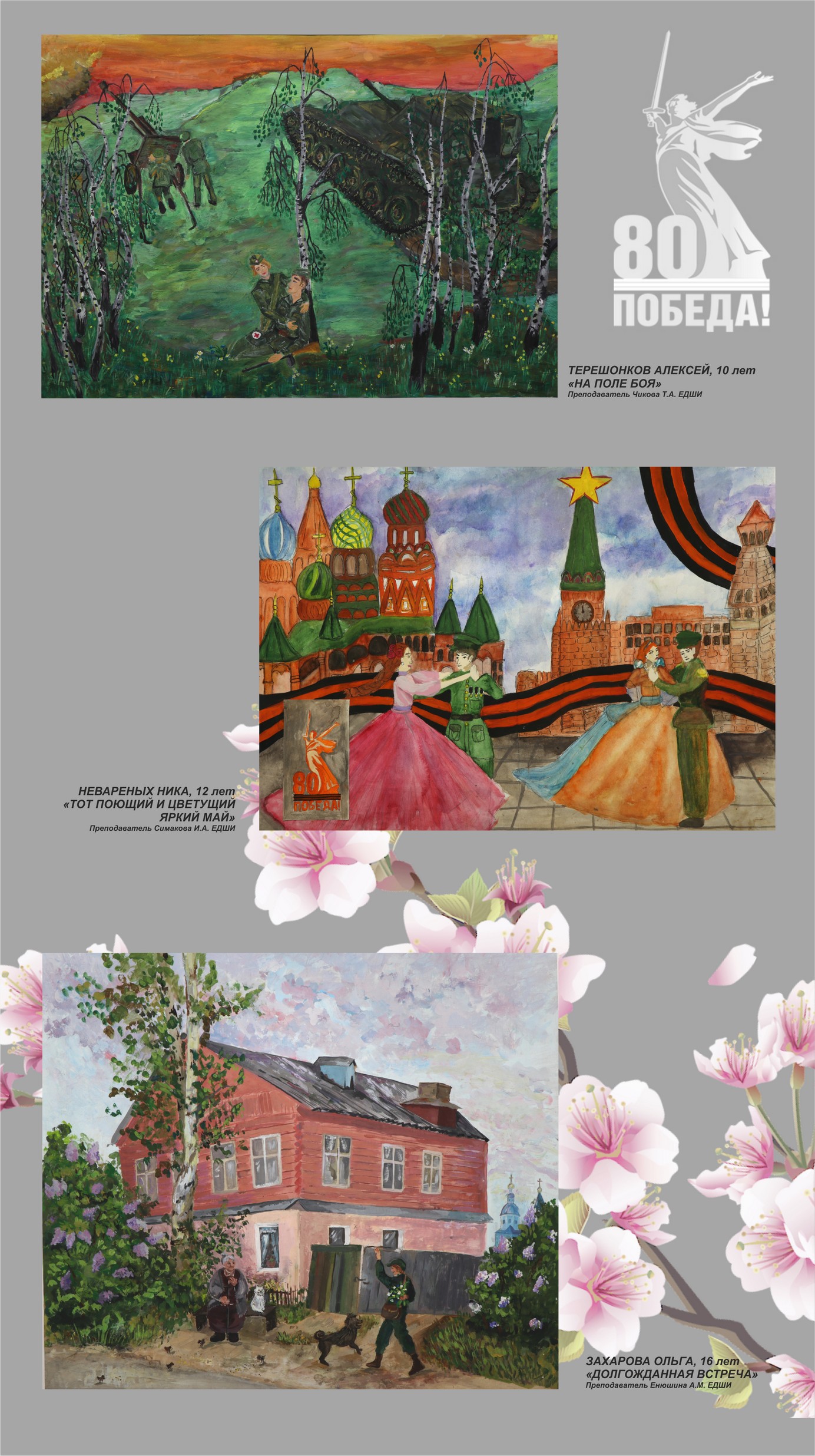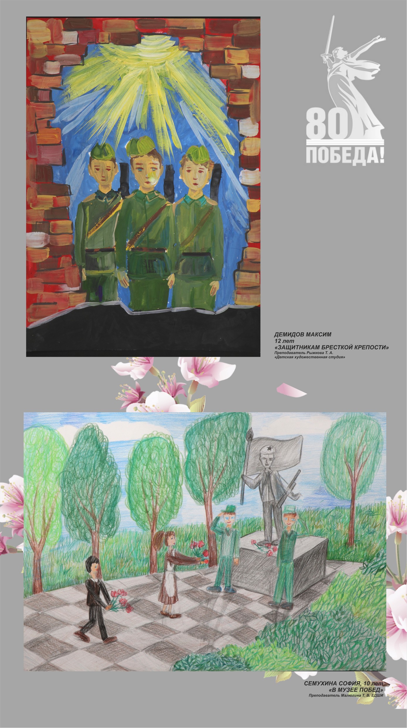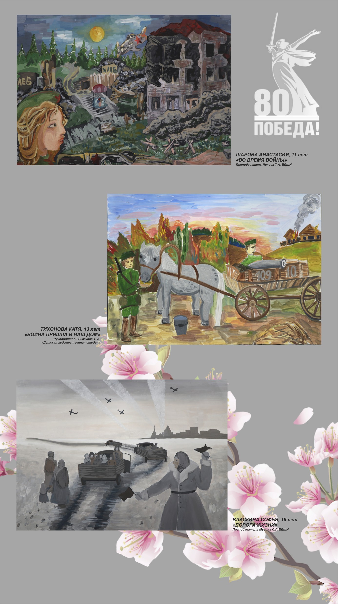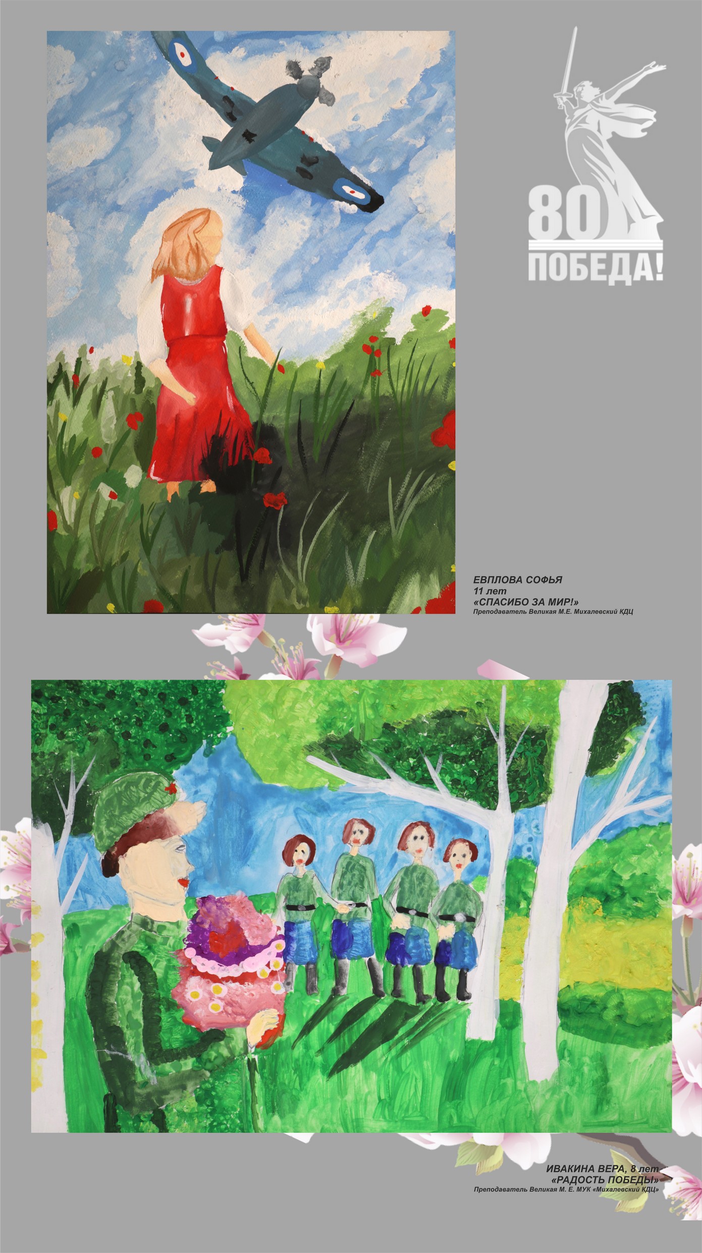 Выставку дополнили детские рисунки, — искренние и непосредственные. Они рассказывают о том, какой ценой досталась Победа, о необходимости сохранения памяти о людях, отстоявших нашу свободу, заставляют задуматься о ценности жизни и о том, как важно сохранить мир на земле.