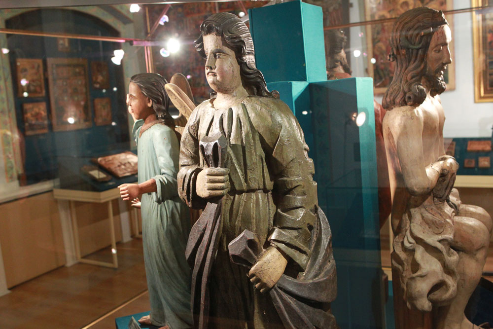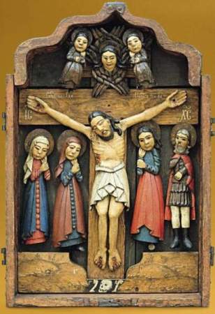 Особое место в русском религиозном искусстве занимают рельефные и объемные изображения из дерева. Подобных произведений сохранилось немного. Причиной их исчезновения были не только частые пожары. В течение нескольких веков скульптурные изображения святых запрещались правилами православной церкви. Уникальны фигуры Иоанна Богослова и сотника Лонгина – часть композиции «Распятие с предстоящими» XVIII в. Разнообразна коллекция резных икон и крестов, относящихся к малоизвестному пласту народной культуры. Рядом с паломническими иконами Киево-Печерского монастыря находятся резные изделия из Троице-Сергиевой лавры, выполненные известным резчиком И.С. Хрустачевым. Музейное собрание икон – небольшое, но в нём – огромные редкости: икона «Святая Афонская гора» с изображением главных храмов и монастырей и надписями об их хозяйственной деятельности, икона «Добрый пастырь» с портретом императора Александра II. Невероятным везением для собирателя было найти икону «Святой Христофор с песьей головой» XVII в. Такое изображение святого основывалось на народных преданиях о его жизни. Подобные иконы уничтожались или переписывались по требованию церкви в XVIII в., т.к. считалось, что святой римский воин не должен изображаться в непотребном виде. Неизгладимое впечатление оставляет изображение Страшного Суда. Перед зрителем возникают картины последнего суда над всем человечеством, воскресения мертвых, сцены адских мучений и райского блаженства. Обращает на себя внимание походная церковь XVIII в. Этот складень-полиптих, состоящий из 15 частей, использовался для свершения богослужения вне церкви, имел широкое бытование в старообрядческой среде. |